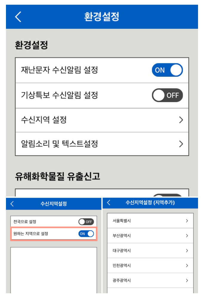 3. 안전디딤돌 어플 접속 후 환경설정-수신지역-본인의 지역추가