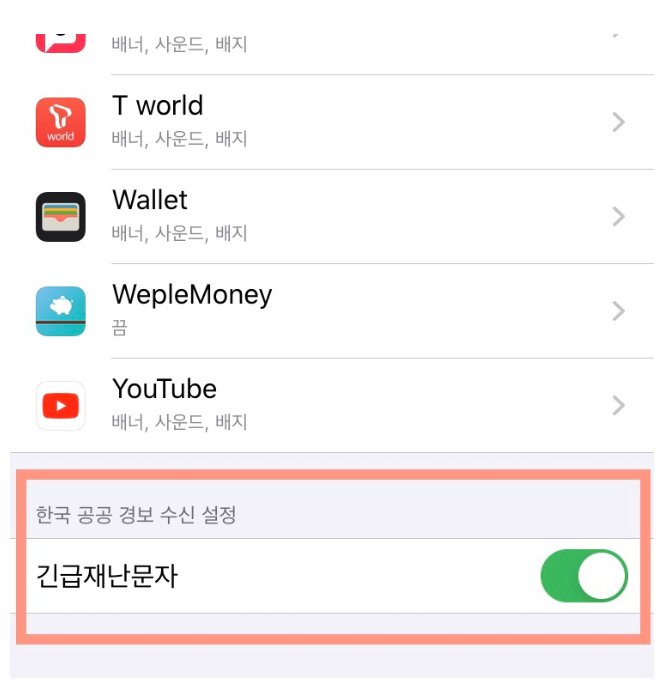 2. 하단 스크롤바 내린후 [긴급재난문자] 비활성화
