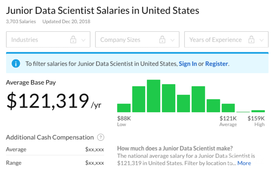 Glassdoor에 따르면, 주니어 데이터 과학자의 평균 연봉은 12만 1천 달러 또는 매달 10,000달러 이상이어야 합니다. 솔직히 말해서, 이 수치들은 상당히 미친 것처럼 보입니다. 특히 미국의 전체 평균 급여와 비교해보면 더욱 그렇습니다.
