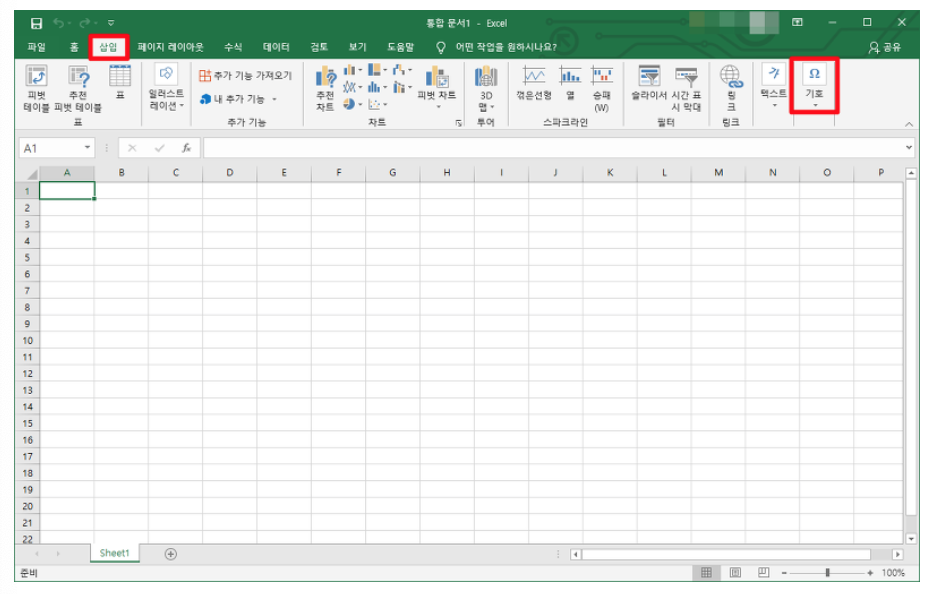 엑셀 파일을 연후 상단 카테고리중 [삽입] - 오른쪽 [기호]