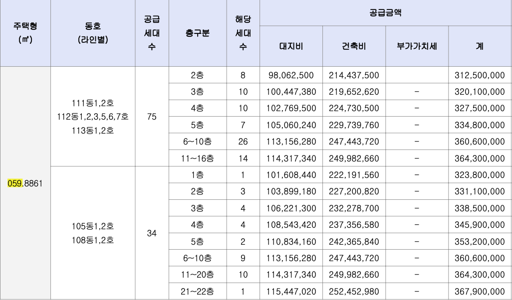 59제곱 (23평형) 21~22층기준 : 3억6천790 + 확장 2100 + 이자 1150 = 약 4억 이상 (평당 1740만원)
