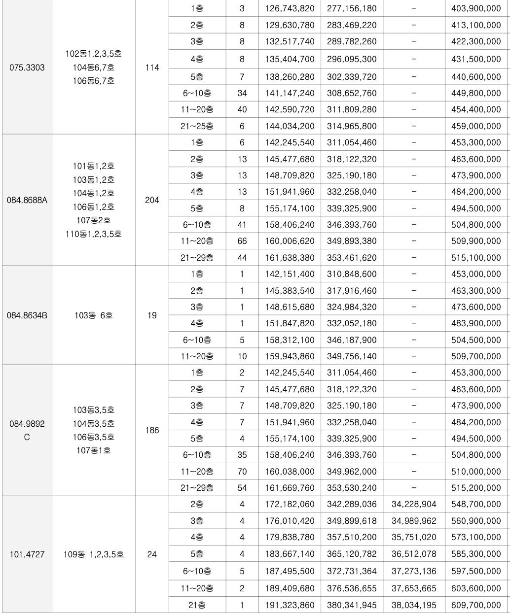 101 (39평) 21층기준 : 6억970 + 확장 2900 + 이자 1950 = 약 6억8520만원 (평당 1687만원)