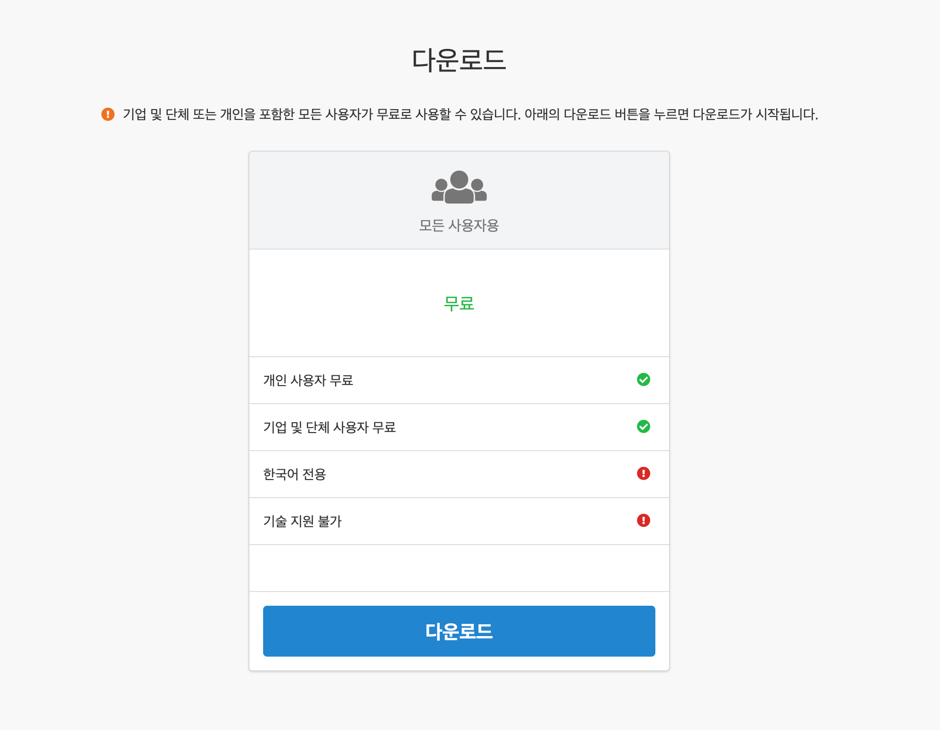 다운로드 화면에서 아래 [다운로드] 를 클릭해 줍니다. 다운로드에는 개인사용자 무료, 기업 및 단체 사용자 무료 입니다. 모든 사용자에게 무료로 진행되고 있다는 아주 착한점이 있습니다.