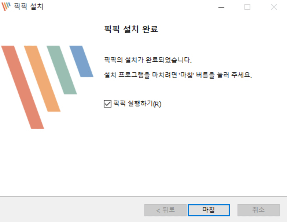 마침내 픽픽이 설치 완료되었습니다. "픽픽실행하기" 체크후 [마침]을 누르면 바로 픽픽을 실행할수 있습니다.