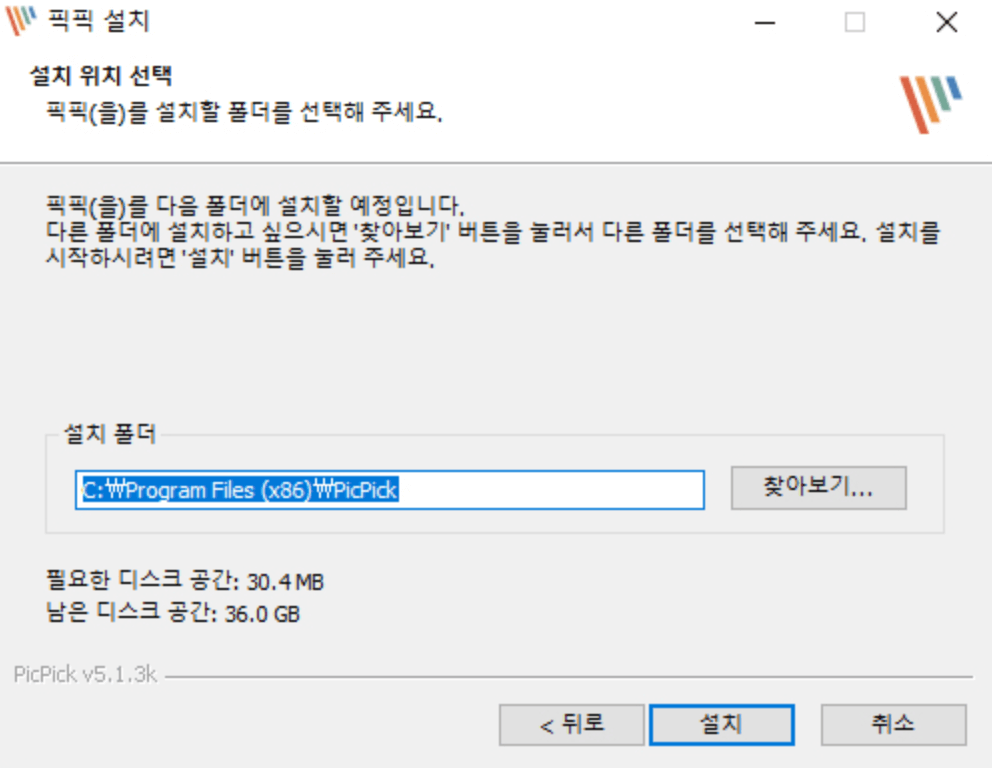 픽픽이 설치될 장소를 지정합니다. 혹 다른 폴더에 설치를 원하면 '찾아보기' 버튼을 눌러 다른 폴더를 선택해 설치를 시작할수 있습니다.