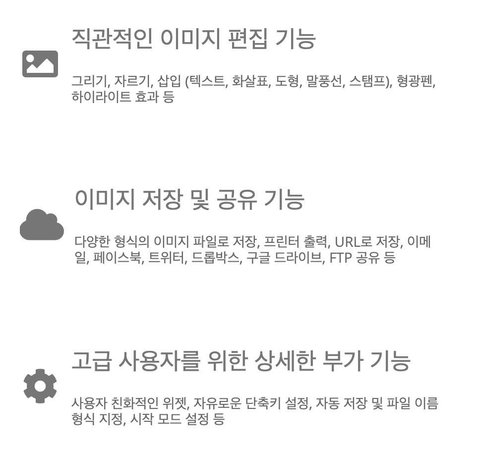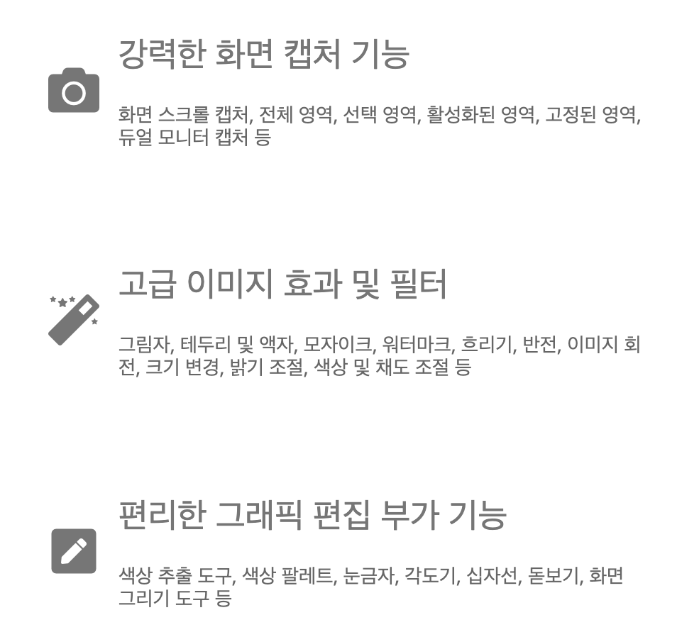 픽픽은 화면캡쳐, 이미지 효과및 필터, 그래픽 편집 부가기능, 직관적인 이미지편집, 이미지저장 및 공유기능, 고급사용자를 위한 상세한 부가기능 등의 다양한 기능들을 사용할수 있습니다.