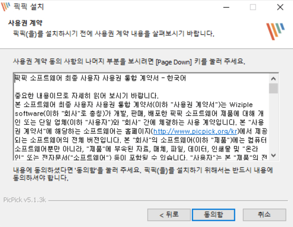픽픽 사용권 계약 내용입니다. 중요한 내용이므로 자세히 읽어 보시고 [동의함] 을 클릭합니다.