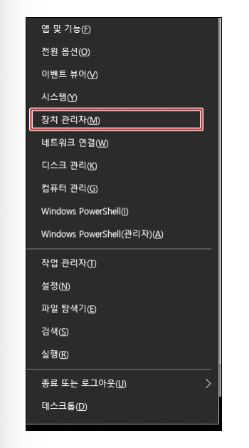 장치관리자 에 접속하기 위해 단축키 사용으로도 가능 합니다. [윈도우키]+[x] 동시 눌러줍니다.