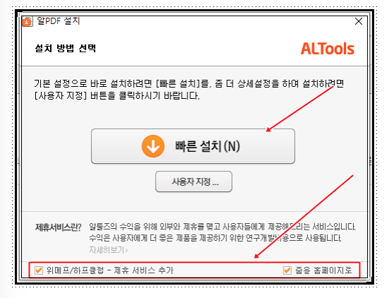 5. 이번에도 역시 하단부를 살펴 보시고 필요하지 않는 제휴서비스 체크해제 합니다. [빠른설치] 클릭