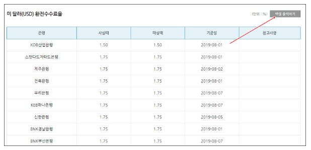 일반영업점의 경우 1.75% 입니다. 이는 [엑셀출력하기] 를 통해 출력본을 받을수 도 있습니다.