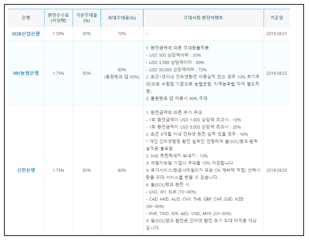 최근에는 인터넷을 이용해 환전시 최대 90%까지 후대 받을수가 있는데 환율 수수료 정보를잘 확인해서 환전 받아 보세요