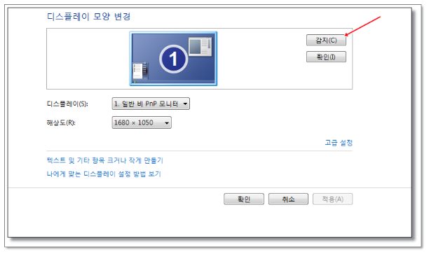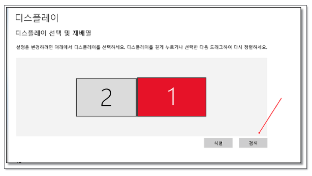 모니터 연결후에도 화면처럼 1개만 표시되었다면 [감지] 클릭