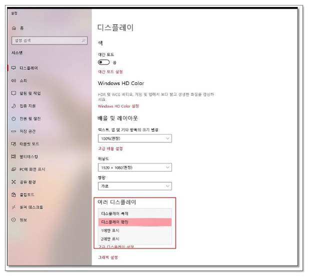 디스플레이 설정메뉴 하단 [여러디스플레이]