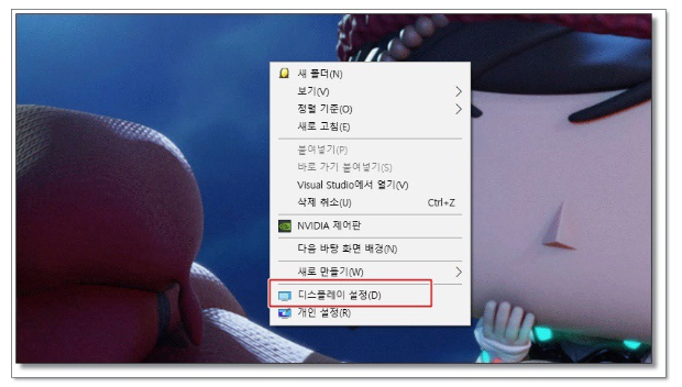 배경화면 마우스 오른쪽 클릭후 [디스플레이 설정] 클릭