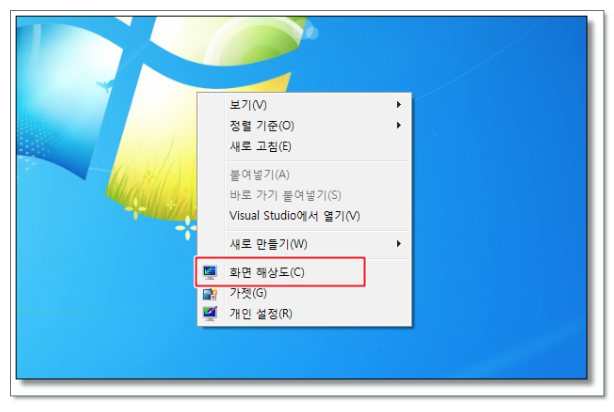 배경화면에서 마우스 오른쪽 클릭후 [화면해상도] 이동