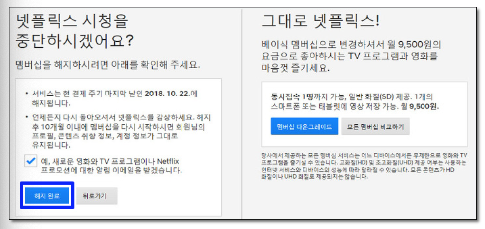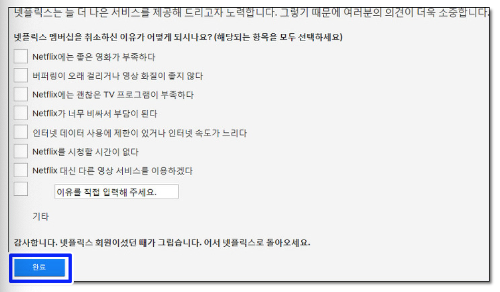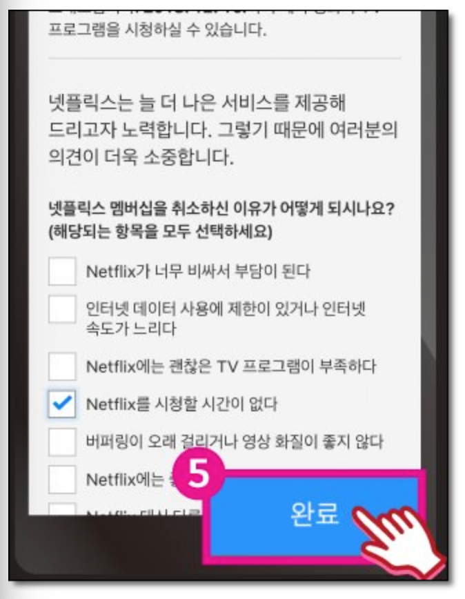 5. 넷플릭스 해지 사유를 체크후 완료 터치