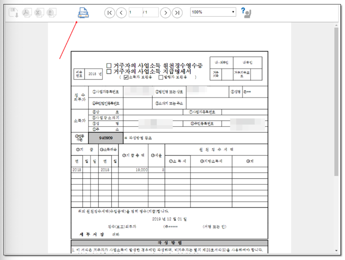 위와 같은 파일을 확인할수 있습니다. 발급받고자 하는 문서를 연뒤 [인쇄] 버트는 누르면 근로소득 원천징수영수증 발급 받을수 있습니다.