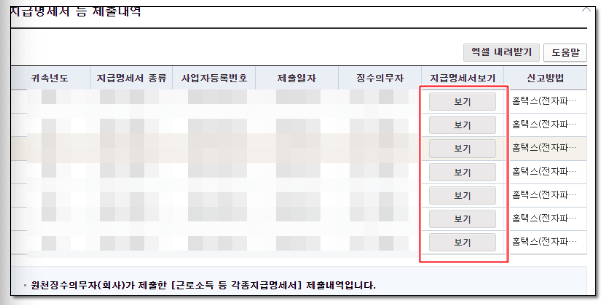 발급받을수 있는 근로소득원천징수영수증 항목이 표시됩니다 원하는 항목 [보기]클릭 합니다.