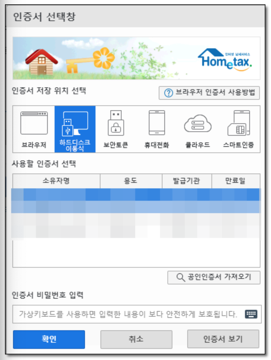 본인 인증서 선택 및 인증서 비밀번호 입력 후 [확인]