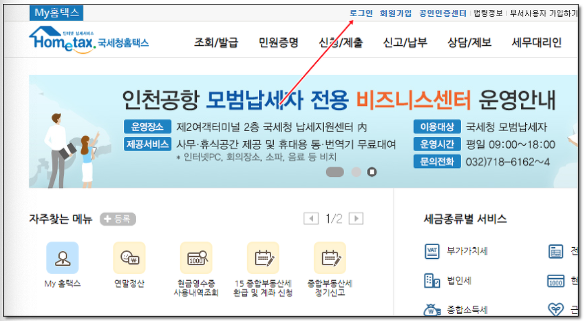 홈택스 사이트 이동후 상단 [로그인] 해 줍니다. 회원가입 전 인분들은 회원가입후 진행 하시면 됩니다.