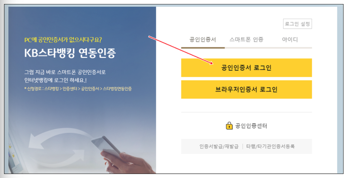 방법에 따라 공인인증서로그인 및 스마트폰인증 등 자신에 해당하는 로그인 방법을 선택해 줍니다.