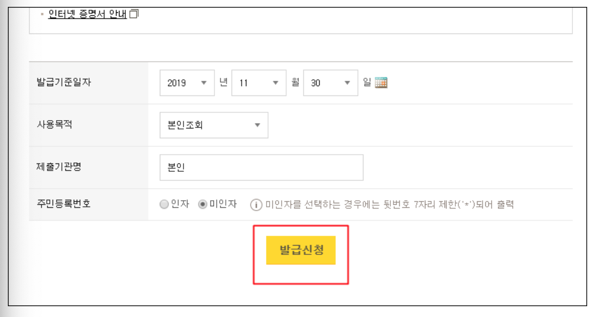 사용목적 및 제출기관명 본인 주민등록번호 입력후 [발급신청] 해줍니다.