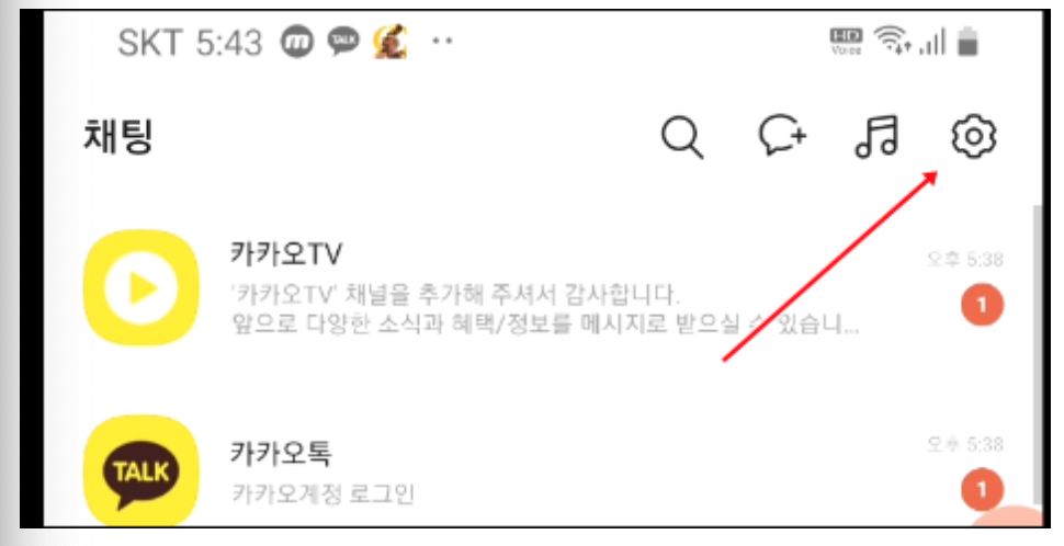 먼저 카카오톡을 실행해주고 카카오톡 오른쪽 상단의 톱니바퀴 모양을 터치 합니다.
