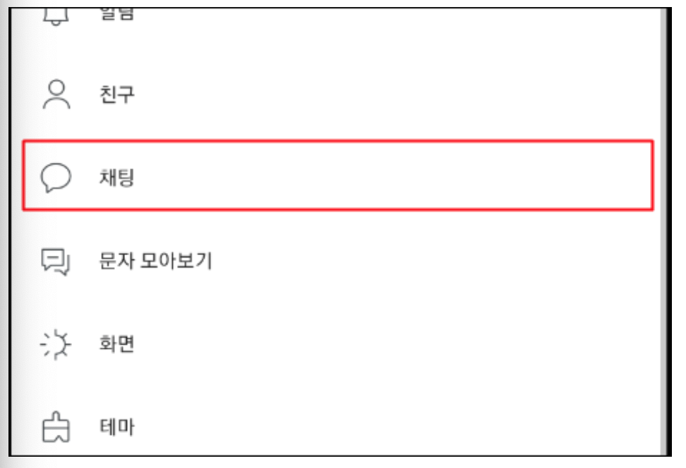 설정 항목 이동후 [채팅] 메뉴 터치해 줍니다.