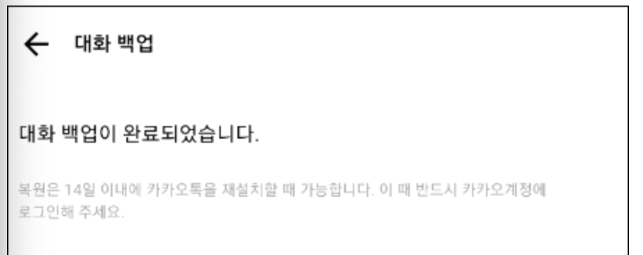 대화 내용이 백업 되었습니다. 대화내용을 복원하고 싶을경우 14일내로 카카오톡을 재설치 하면 언제든지 대화내용 복원 할수 있습니다.