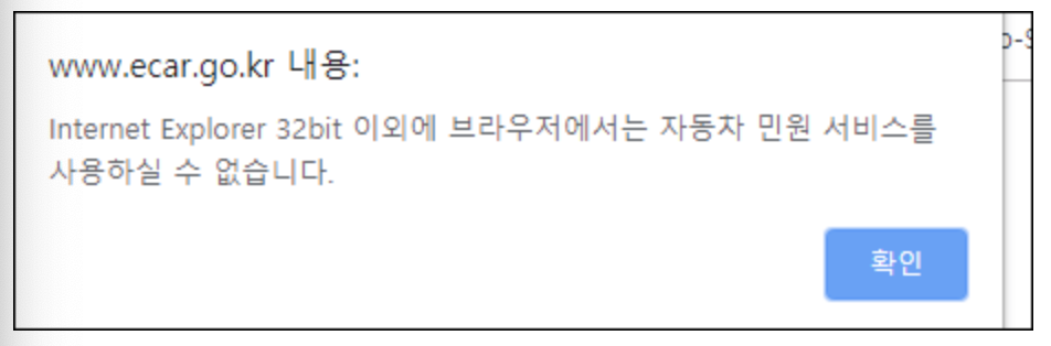 2. 위와같은 경우 익스플로러 브라우저를 사용하지 않을경우 뜨게 됩니다. 자동차민원 대국민포털을 이용하기 위해서는 인터넷 익스플로러 브라우저를 꼭 사용 해야만 합니다.