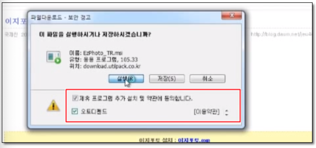 보통 애드웨어 프로그램은 제휴프로그램으로 선택되어 저장된다. 보통 파일을 다운받거나 실행함에 있어서 위의 파일자료만 생각하기 마련인데 아래 정보를 잘보면 제휴프로그램 다운 설치도 함께 설정되어 있다. 이때 아래까지 꼼꼼히 잘 읽어보고 필요치 않은경우 체크해제를 해준다.