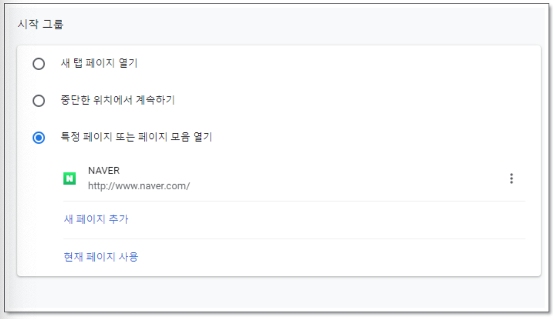 3. 설정페이지 하단부 보면 시작그룹 항목을 볼수 있습니다. 이 항목중 [특정 페이지 또는 페이지 모음 열기] - [새 페이지 추가] 클릭