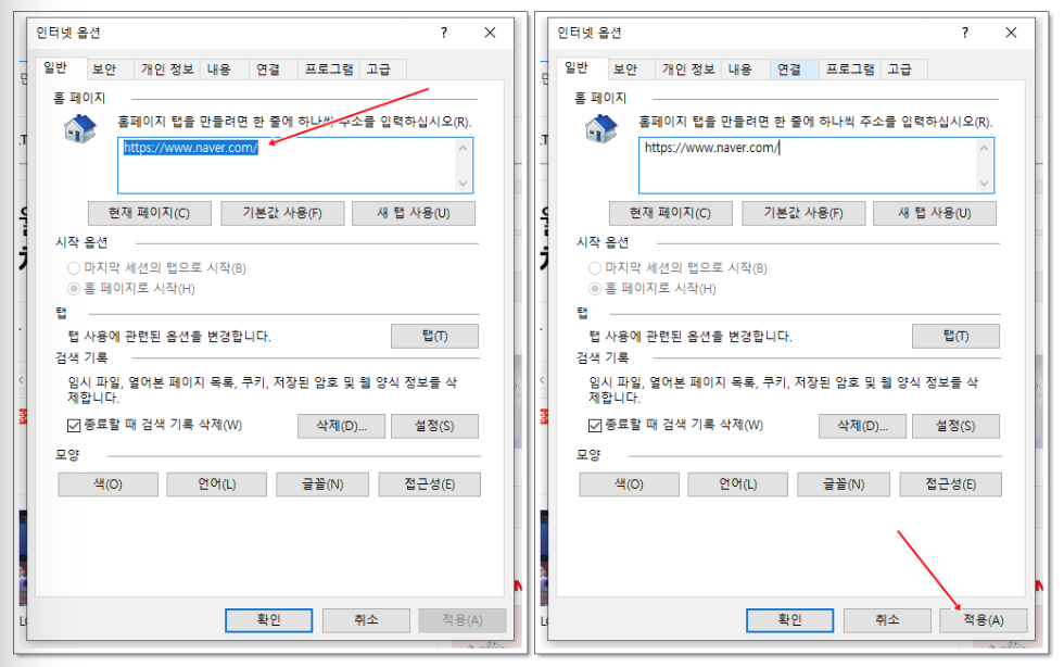 2. 각종 툴바 설치 이후 (제휴사이트) 시작페이지가 바뀐 경우 네이버를 시작페이지로 바꾸기