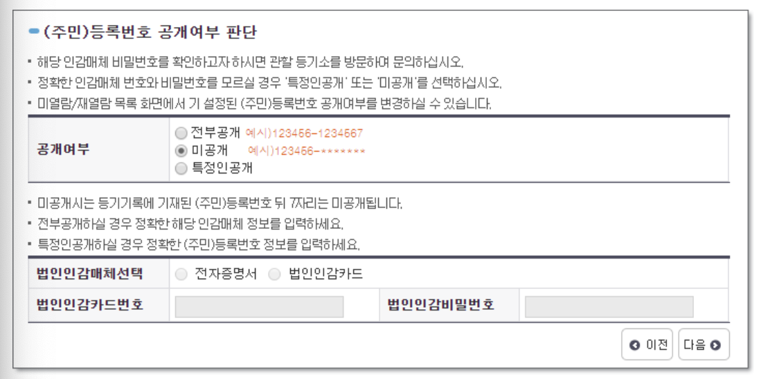 8. 법인 관계자가 아닌 제 3자의 발급인경우 미공개 선택해야 합니다. 전부공개 하는 경우는 임원의 주민번호가 나오지 않기 때문에 법인인감 매체가 필요할수 있습니다.