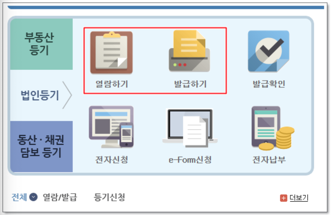 3. 법인등기 메뉴에 들어가면 [열람하기][발급하기] 메뉴를 볼수 있습니다.
