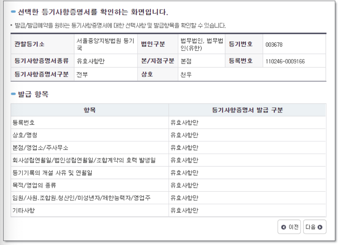 9. 선택한 등기사항증명서 내용을 다시한번 확인해 주세요. 확인되셨다면 [다음] 눌러 줍니다.