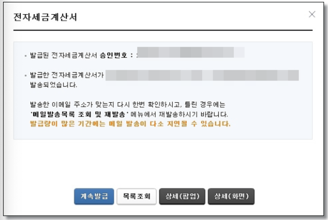 10. 전자세금계산서 발급창이 뜹니다. 읽어 보시고 계속 발급을 원하면 [계속발급] 또는 창을 닫으셔도 됩니다.