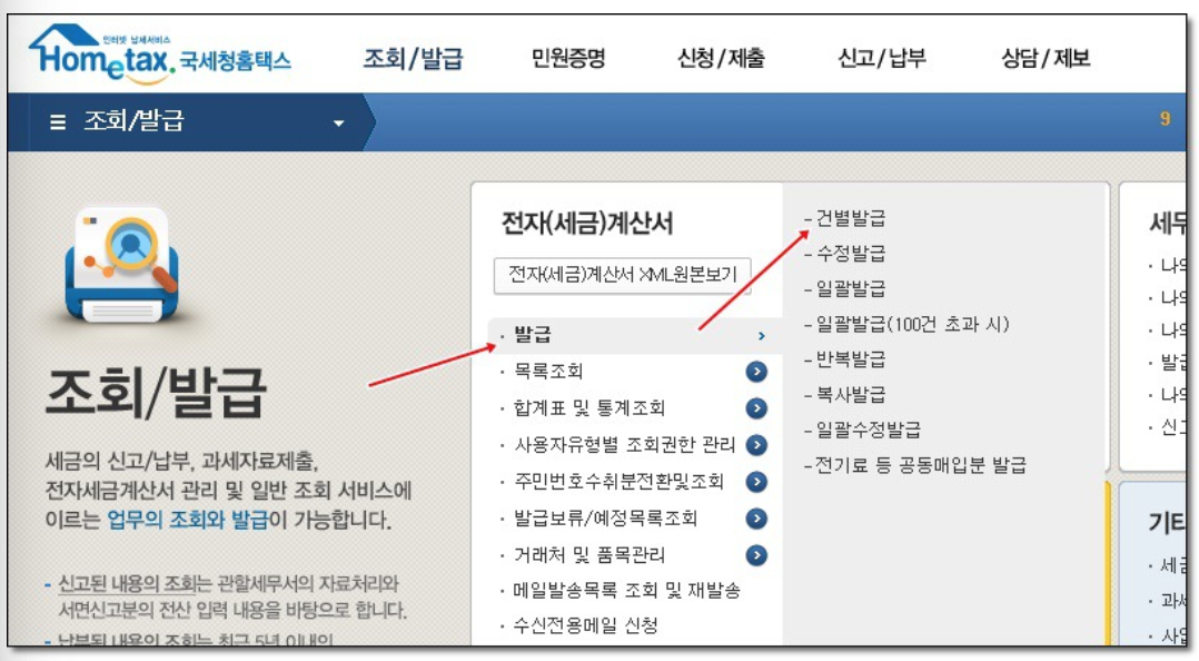 5. 조회/발급 으로 이동 했다면 [발급]-[건별발급] 메뉴로 이동합니다.