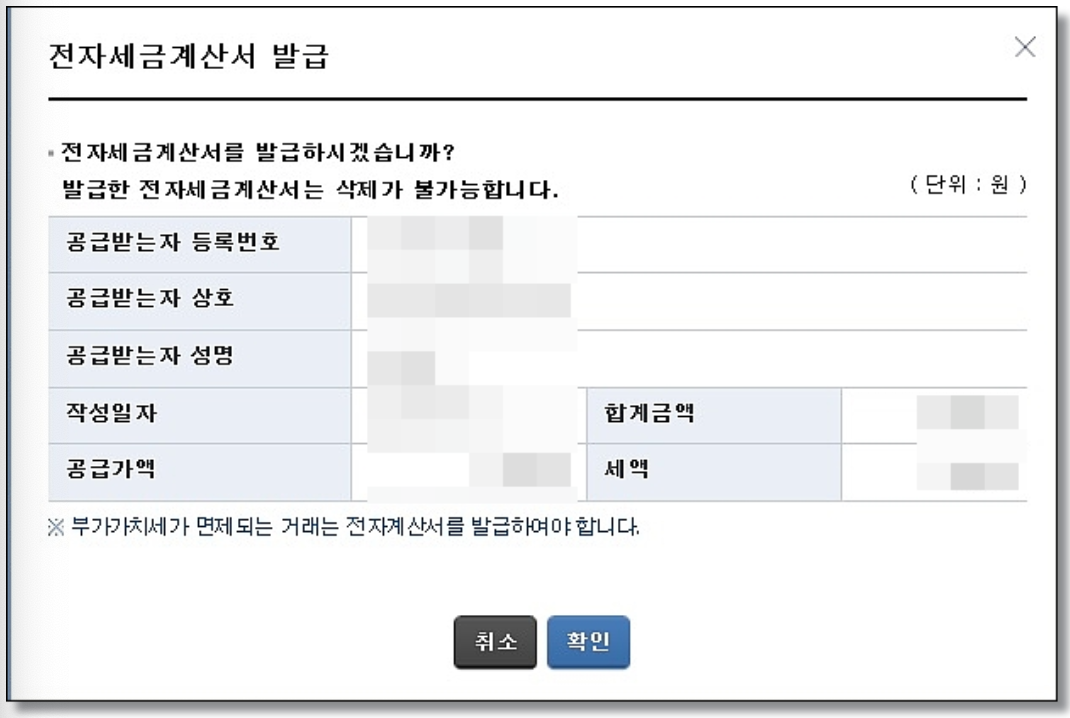 8. 발급버튼 클릭후 전자세금계산서 발급확인창 확인 합니다. 한번더 확인후 정보기입이 맞다면 [확인] 버튼 눌러줍니다.
