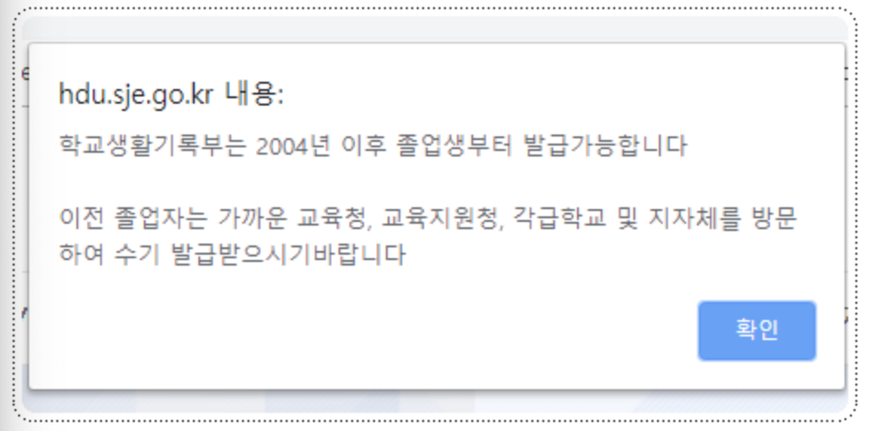 5. 학교생활부 클릭하면 2004년생 이후 졸업생부터 발급가능하다는 팝업창이 뜹니다.
