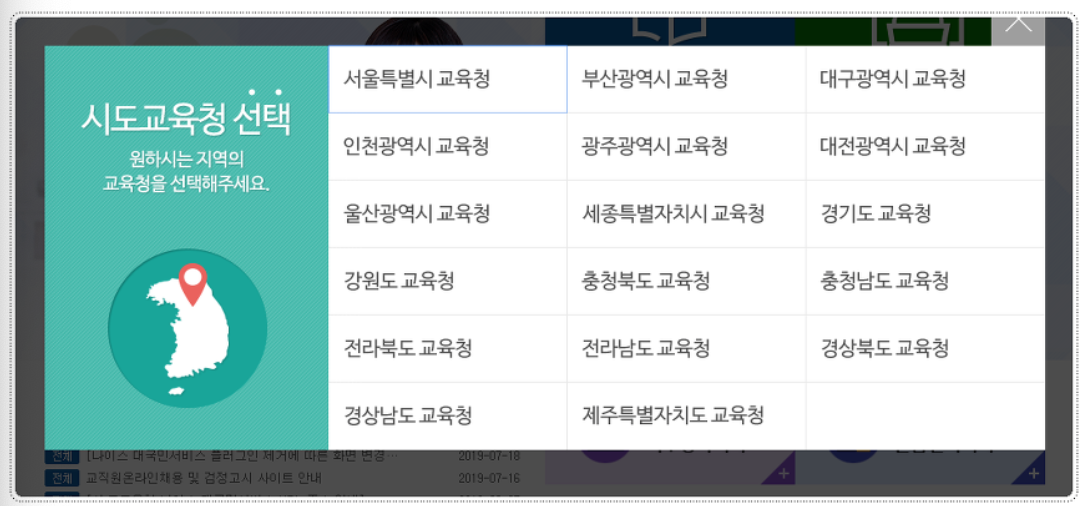 3. 홈에듀 민원서비스 메뉴에 들어왔다면 본인 출신의 교육청을 선택해 줍니다.