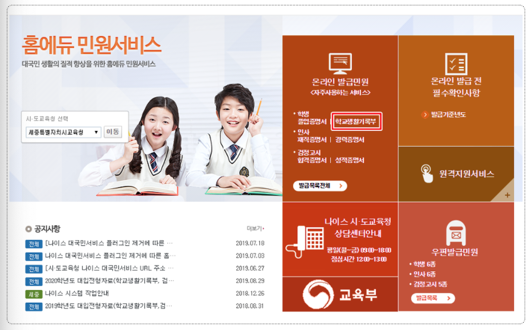 이곳에서 졸업증명서 / 성적증명서 / 학교생활기록부 / 검정고시 합격증명서 등등을 발급받을수 있습니다.