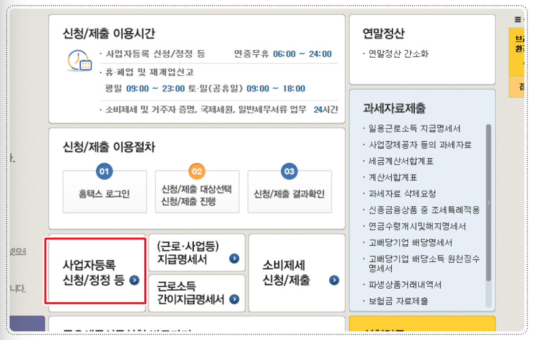 4. 화면의 아래쪽을 훑어 보면 [사업자등록신청 / 정정등] 항목이 있습니다. 클릭합니다.