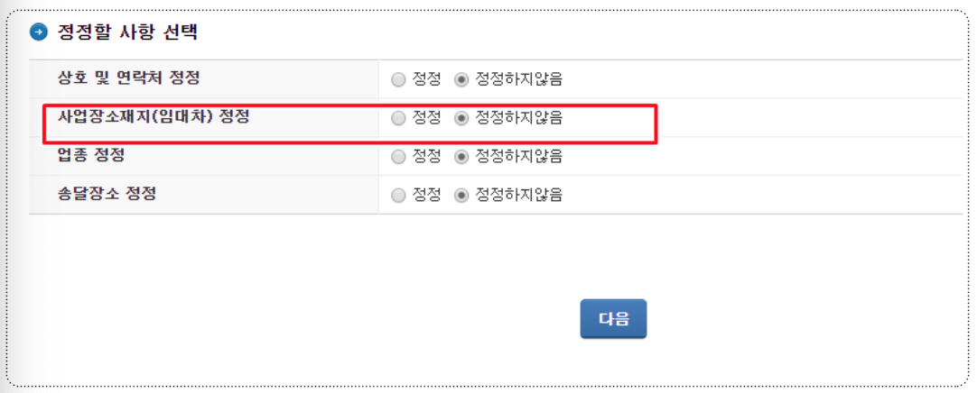 7. 사업장소재지(임대차)정정 메뉴에서 [정정]체크후 다음 눌러줍니다.