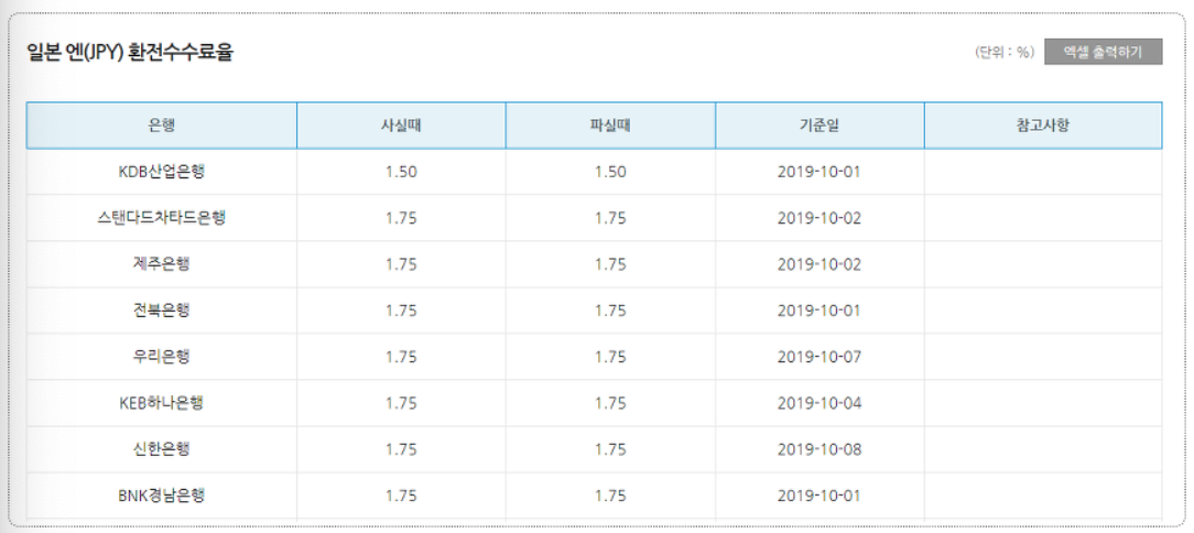 7. 검색결과 를 하시면 각 은행사별 환전수수료율 에 대해 한눈에 쉽게 확인할수 있습니다.
