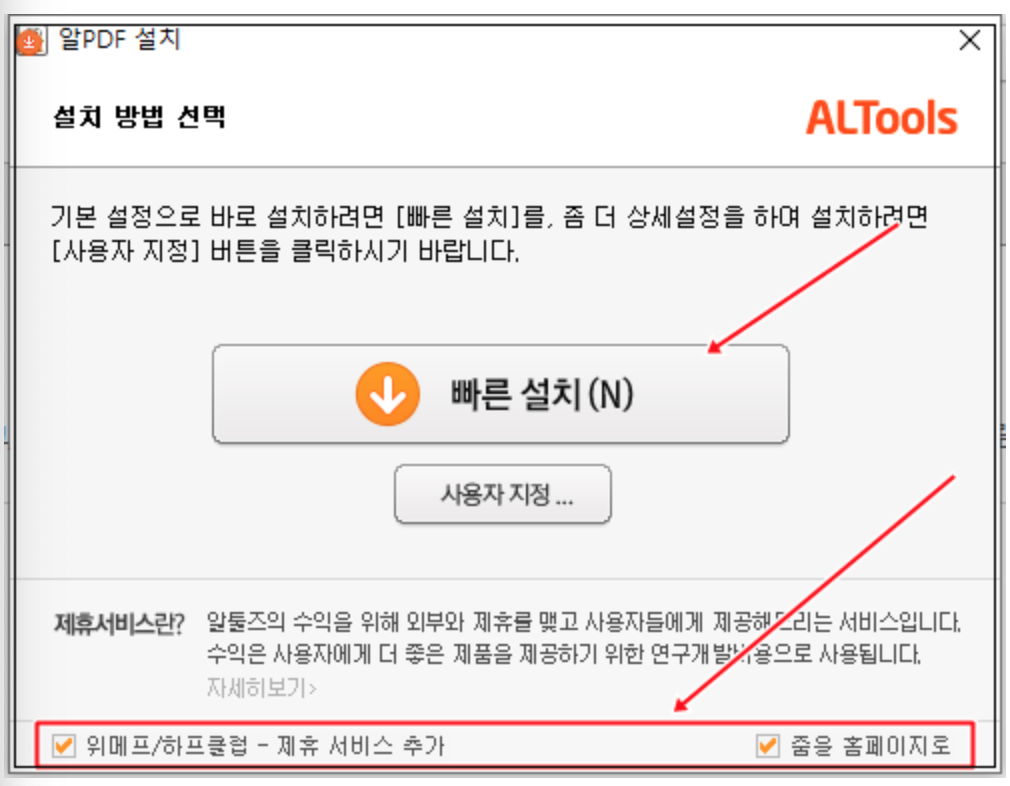 5. 또한번의 설치화면이 보입니다. 똑같이 하단 제휴프로그램 설치여부 확인후 [빠른설치] 클릭