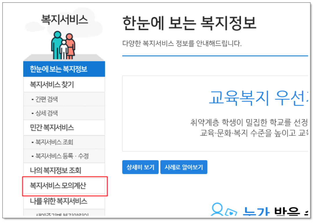 4. 자신이 가능한 복지 혜택은 어떤게 있을지 알아보겠습니다. 왼쪽 [복지서비스 모의계산] 클릭