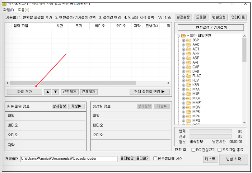 1. 카카오 인코더 실행후 [파일추가] 클릭 후 m4a 파일 불러 옵니다.