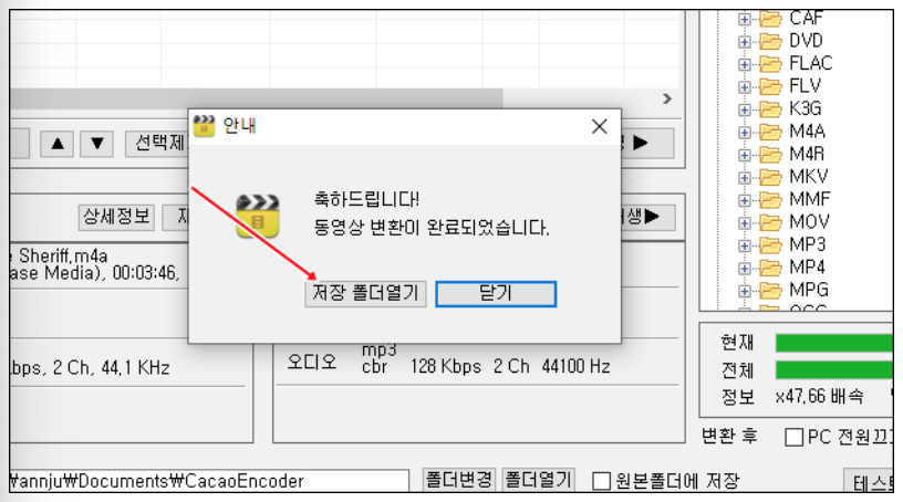 8. m4a mp3 파일 작업이 완료되었다면 [저장 폴더열기] 클릭후 위치 저장 하면 됩니다.