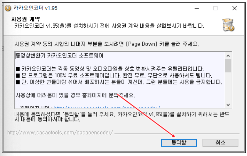2. 카카오인코더 설치 계약 내용 확인후 [동의함] 클릭